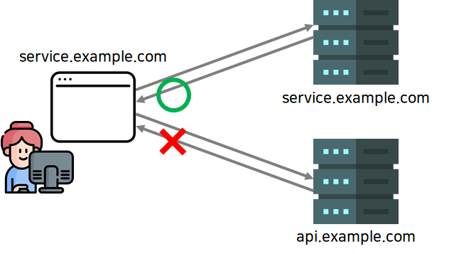 먼저 CORS가 어떤 방식으로 동작하는지 확인해보겠습니다. service.example.com 사이트에서는 api.example.com 사이트의 리소스를 가져오기 위해 아래와 같은 JavaScript를 구성하였습니다.